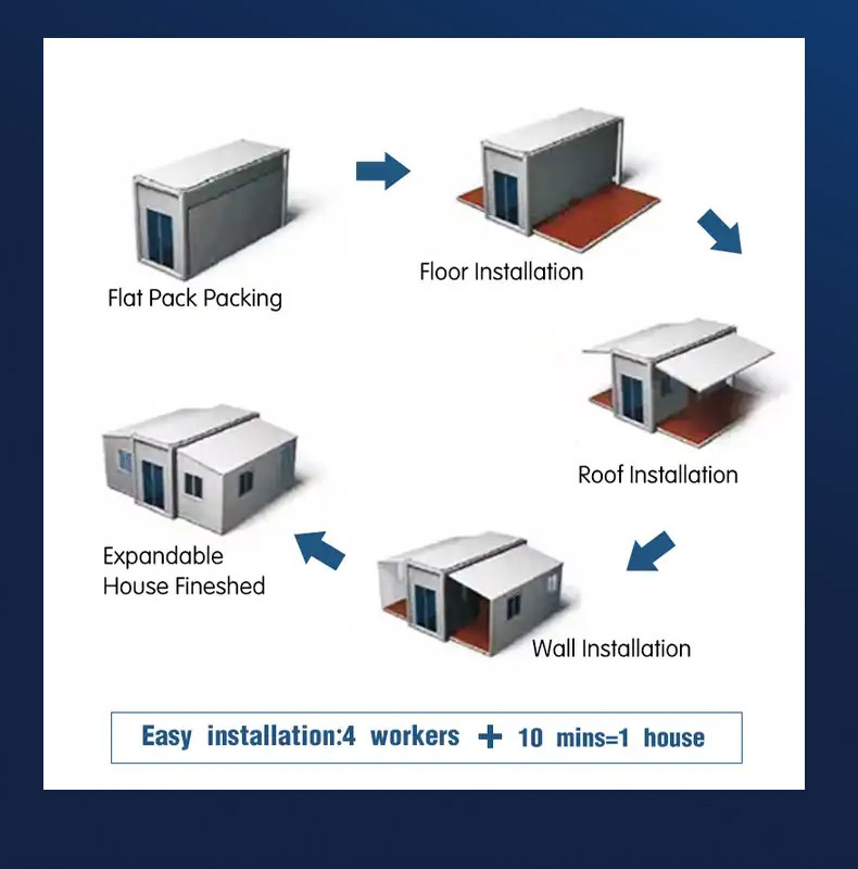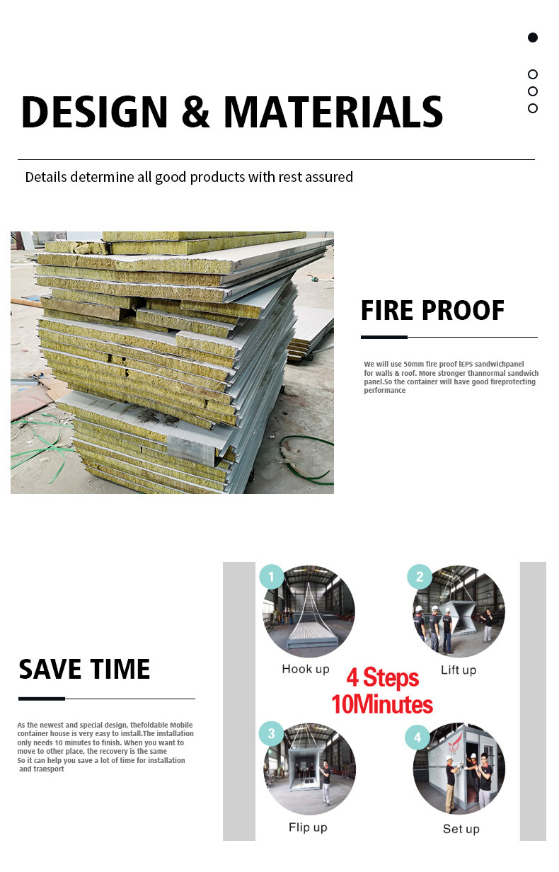 Собственный вес расширяемого контейнерного дома превышает две тонны. Он состоит из мягкой металлической формы и металлической сэндвич-панели. Устойчивость к ветровым нагрузкам составляет 90–110 км/ч, а сейсмостойкость — более 8 баллов. Он используется при температуре -40 градусов, а температура в помещении является нормальной. Он имеет превосходную теплоизоляцию, которую обеспечивает изоляционный материал наружных стен.